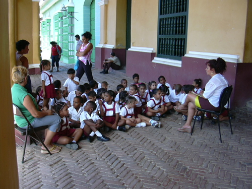 A group of school children being taught on the front porch of the Galeria de Arte (I think). They had probably just been on a tour there.