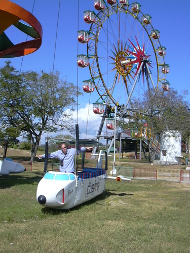 A curious feature of the park was a carnival that had been built by the Japanese in the mid-1980s. It was either shut down or just open on weekends. We couldn't figure out which. Here we see Jim 'flying the friendly skies' of Cubana Airlines.