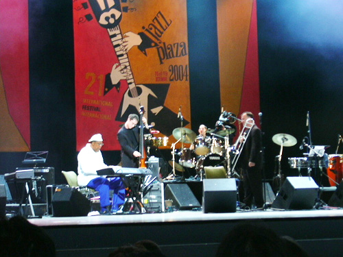 Paul's Festival Pass Jim and Paul in front of a mural in the lobby of the Karl Marx Theatre in Miramar, Havana, where the Opening and Closing Gala Concerts took place. Happy guys! 'Decidedly Jazz' from Toronto opened the festival on December 16th, 2004. The Hugh Fraser Quintet from Vancouver, with a sax player from Irakere sitting in for someone who didn't make it there. Chucho Valdes with Hugh Fraser Chucho Valdes with Hugh Fraser Some impressionistic camera work! The big finale jam on Opening Night - Habana Ensemble y sus invitados - the young up-and-comers. A blurry shot of a couple of the old guys who sat in on percussion for a very memorable number. Nick 'Brownman' Ali [trumpet] and his brother Marcus [sax] from Toronto. They were one of many highlights of a 'Conceirto de Trumpetas en el Jazz' on December 17th. Another trumpet night moment. Ruth Kozak raved about this guy - Yasek Manzano. She said she hadn't been so moved by a jazz trumpet player since she saw Chet Baker in Vancouver in 1953. That concert was the start of Ruth's passion for jazz. ![]() December 18th found us at the outdoor Casa de Cultura de Plaza. Jim and Ruth are in a special area for pass holders. [Me too.] ![]() First up was the Point Loma University Jazz Ensemble from California - the only USA band in attendance. Perhaps because they were students they got to go. Who knows? The playing was pretty good, but the vocalists just weren't up to it. Young white gals just don't have the life experience to tackle songs made famous by the likes of Billie Holiday and Etta James. ![]() Leo Gandleman from Brazil. Great player - bad jacket! ![]() This young Cuban pianist with Leo was quite amazing. Never heard who he was. ![]() The big finale of the show was Jose Luis Cortez y NG la Banda who really rocked the plaza. ![]() Jose Luis Cortez y NG la Banda ![]() Lots of extra singers and dancers and players throughout the set. No encore though - didn't see a single encore in the whole festival. ![]() What jazz festival would be complete without a guy in a Jesus T shirt? ![]() Maraca y Otra Vision at the Teatro Nacional on December 19th, with all sorts of guest stars, traditional singers and percussionists, and 12 dancers. Another standout show. ![]() Maraca y Otra Vision ![]() Maraca y Otra Vision ![]() Maraca y Otra Vision ![]() Maraca y Otra Vision ![]() For the finale, Otra Vision invited the entire audience up on stage to go nuts with the band. ![]() Chucho Valdes [Festival Artistic Director] introduces the Gala de Clausura at the Teatro Karl Marx on December 19th, 2004 ![]() Chucho with Duo Angelisa ![]() Chucho Valdes, Hugh Fraser and Orlando 'Maraca' Valle ![]() Dueling trumpets ![]() Dueling trumpets ![]() Mayra Caridad Valdes ![]() Mayra Caridad Valdes ![]() l´ensemble vocal Sexto Sentido and Mayra Caridad Valdes ![]() Chucho dancing with Mayra Caridad Valdes [his daughter] ![]() ![]() ![]() l´ensemble vocal Sexto Sentido with Irakere New Conception ![]() Chucho ![]() l´ensemble vocal Sexto Sentido with Irakere New Conception ![]() l´ensemble vocal Sexto Sentido ![]() Chucho ![]() Chucho Valdes, l´ensemble vocal Sexto Sentido, Irakere New Conception and a string section from the Havana Symphony. ![]() Of all the wonderful things about Cuba, the state of their public washrooms was not numbered among them. They were deplorable. One could not imagine that something could smell that bad. We agreed that the washroom at the Teatro Karl Marx was the best in all of Cuba. Not the main one, but the little one adjacent to the bar. Sweet smelling! Clean floor and walls! Toilet paper! Soap! Toilet seats! Running water! HOT water! Lovely artwork on the walls! If you are ever in Habana, check it out.
