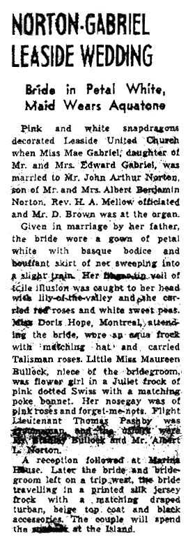 ![]() ![]() Mae Norton graduates from U of T in 1940, with a degree in Physiotherapy. ![]() The wedding of Ray and Marg Booth. Mae Norton, unknown, Marg, Ray, unknown. ![]() Tom Norton in Leaside, September 1940. ![]() Donna Norton [Bullock] with her step mother Mary Norton, probably at her parent's cottage on Steeles Ave, between Yonge and Bayview in Toronto. ![]() Tom Norton in Leaside, 1942. ![]() Jack Norton in his Packard convertable. ![]() Mae and Ted Gabriel, with Doris Hope in the background. ![]() Eve Norton with her aunt Alverna Hobson at the MacMahon farm in 1943. ![]() Jack Norton at Camp Borden during WWII. ![]() Tom and Albert Norton on a picnic in 1942. ![]() The wedding of Jack Norton to Mae Gabriel, on May 23rd, 1942. Left to Right: Stan Bullock, Tom Pashby, Doris Hope, Mae, Jack, and Albert Norton. Flower girl: Maureen Bullock [Verney]. ![]() Clipping from the Leaside Advertiser. ![]() Left to Right: Unknown, Daisy Gabriel , Mae, Jack, Mary and Bert Norton. ![]() Second Lieutenant Jack Norton in his WWII army uniform, probably 1944. ![]() Tom, Eve and Jean Norton in Leaside, 1944. ![]() Tom and Eve Norton in Leaside, 1944. ![]() Tom and Eve pictured on the family Christmas card from 1944. ![]() Mae Norton at 89 1/2 Beaconsfield Avenue. ![]() Pre-Photoshop trick photography. ![]() A very young-looking Mae Norton in the backyard at 12 Sharron Drive. ![]() Mae Norton out horseback riding in the Don Valley. ![]() Jack and Pat Norton, probably 1945. ![]() Tom and Albert Norton - 1945. ![]() Albert and Tom Norton at the farm in the late 40s. ![]() Eve Norton at the farm in the late 40s. ![]() Eve and Tom Norton at the farm in the 1948. ![]() Pat Norton's second birthday, on July 11th, 1947, at Edgecombe Avenue [near Lawrence & Avenue Road in Toronto]. With Emma Brend, 'Auntie' [Florence Waggott] and Florrie Lillie. ![]() Pat Norton coming up the walk on her trike in the late 40s. The same trike she got for her second birthday! ![]() Tom, Albert and Eve Norton in 1948. ![]() Tom and Eve Norton going to Sunday School in 1949. ![]() Albert and Jean Norton in the kitchen of their farmhouse all the way out in the wilderness of Scarborough - late 1940s. ![]() Jack Norton with the Dodge that he bought from Dr. Hall. After the war when car production resumed, there was a huge demand and priority was given to people like doctors. Our family doctor got a new one and sold his old one to Jack. ![]() Bert and Mary Norton at Edgecombe Avenue, Toronto in October 1949. |