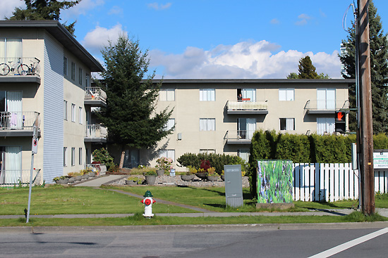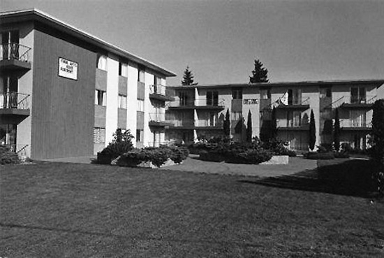 | Here's a typical three story apartment on the northeast corner of Gilley and Kingsway. There has been some minor facelift work done, but essentially it is the same now as it was in 1976. I think I liked it better back then, before the 'improvements'. |