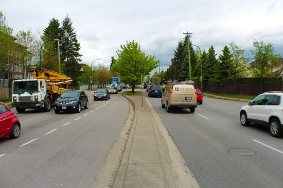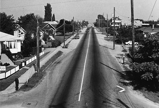 | This is a view of Boundary Road looking north from the railway trestle just north of Kingsway. I have no recollection of actually taking the 1976 picture, but looking at it today I can only assume that I was more of a daredevil then than I am now. The trestle is used nowadays by Translink for the Skytrain, and I couldn't get anywhere near it even if I wanted to. I had to settle for a shot taken at ground level, standing in the middle of the road on a traffic island. |