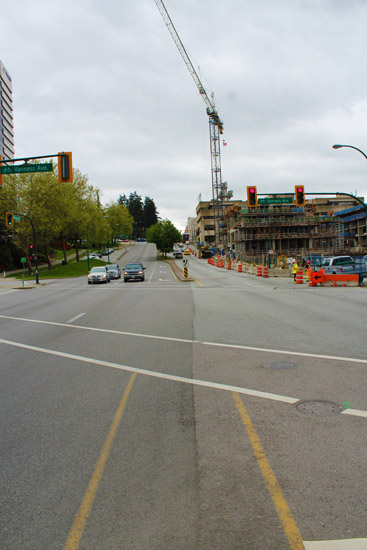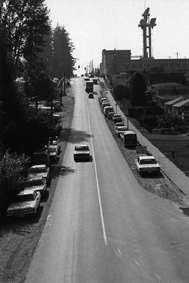 | This is another view of Boundary Road, this time looking south from the railway trestle just north of Kingsway. I have no recollection of actually taking the 1976 picture, but looking at it today I can only assume that I was more of a daredevil then than I am now. The trestle is used nowadays by Translink for the Skytrain, and I couldn't get anywhere near it even if I wanted to. I had to settle for a shot taken at ground level, standing in the middle of the road on a traffic island. (I'll bet you that the car parked on the right side of the road closest to the trestle is my ride - a white 1966 Plymouth Fury 4 door sedan that I bought for $600.) |
